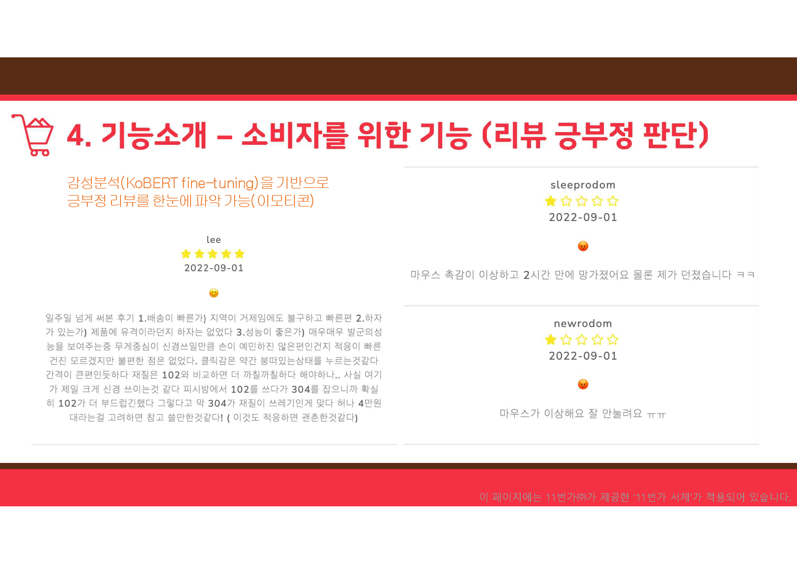 이 모델을 활용해 아래와 같이 소비자들의 리뷰에 대해 긍정과 부정을 구분할 수 있습니다.