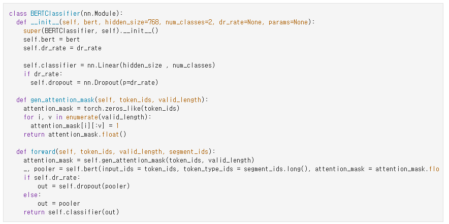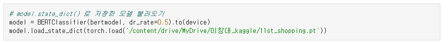 BERTClassifier을 정의한 후 이전에 state dict로 저장했던 모델을 불러옵니다.