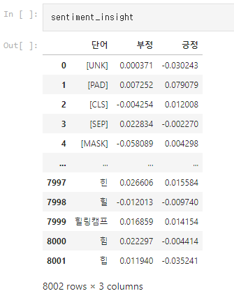 이를 정리하면 위와 같은 dataframe을 얻을 수 있습니다. 각 단어에 대한 부정, 긍정에 영향을 미치는 수치를 확인할 수 있습니다.