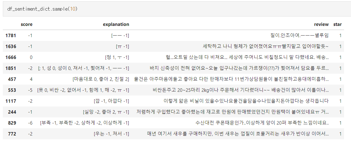 이후 10개의 리뷰를 뽑아 확인해보았습니다. 1점리뷰에 대해 음의 점수를 주었기에 나쁘지 않게 분류해 내는 모습을 볼 수 있습니다. 또한 explanation에서 부정에 영향을 준 단어를 볼 수 있다는 장점이 있습니다.